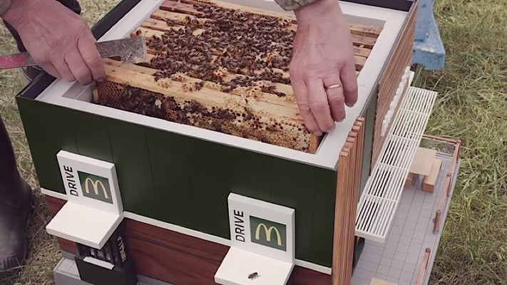 Mit allem was dazu gehört.... Erst vor kurzem hat McDonald’s die Menükarte um eine tierleidfreie Option erweitert. Neben Pommes und Apfeltasche gibt es nun auch einen veganen Burger. Jetzt setzt die Fast-Food-Kette, vorerst mal in Schweden, noch einen drauf. In Zusammenarbeit mit der Kreativagentur NORD DDB hat McDonald’s ein Miniatur-Restaurant entworfen. Die „kleinste McDonald’s-Filiale der Welt“ ist ein Bienenhotel – fix und fertig mit Drive-Thru und Bistrotischen auf der Terrasse. Das goldene „M“ auf dem Dach darf natürlich auch nicht fehlen.